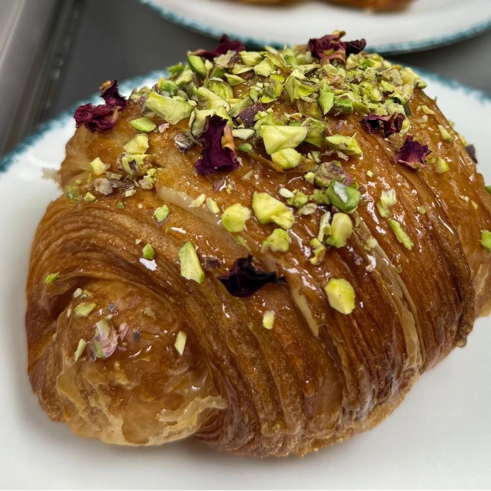 French butter croissant, baklava mixture, honey glaze, crushed pistachios, dried rose petals, gold leaf.