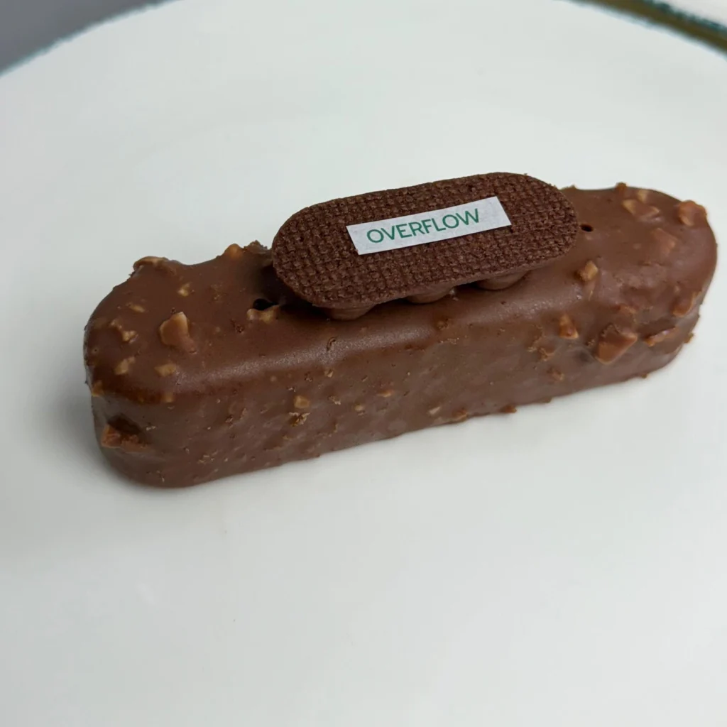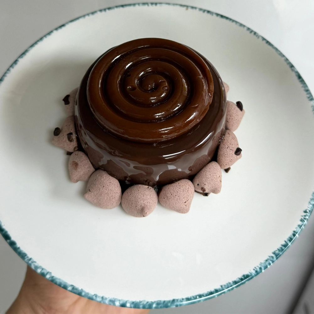 Chocolate mousse, almond & cocoa nib praline, crunchy cocoa meringue, gluten-free chocolate brownie, chocolate caramel.