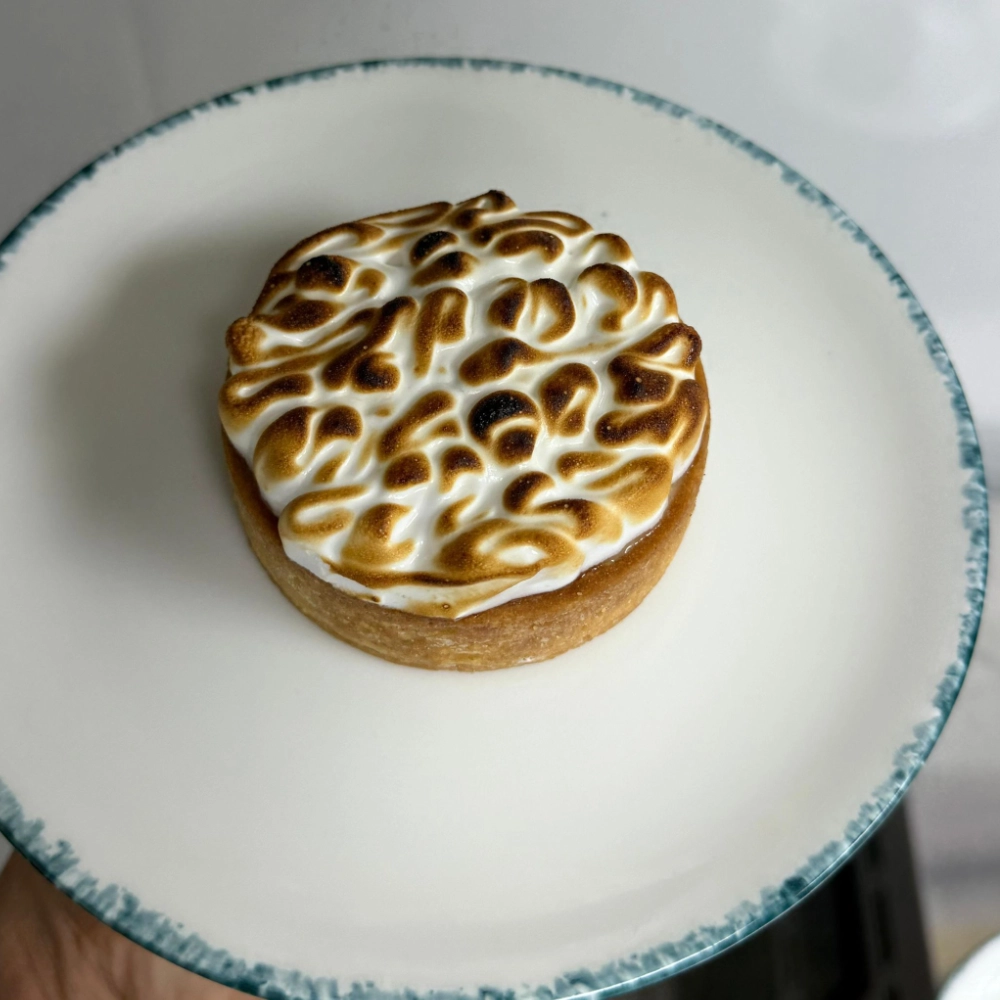 Lemon curd, vanilla sable base, almond cream, toasted meringue, gold leaf garnish.