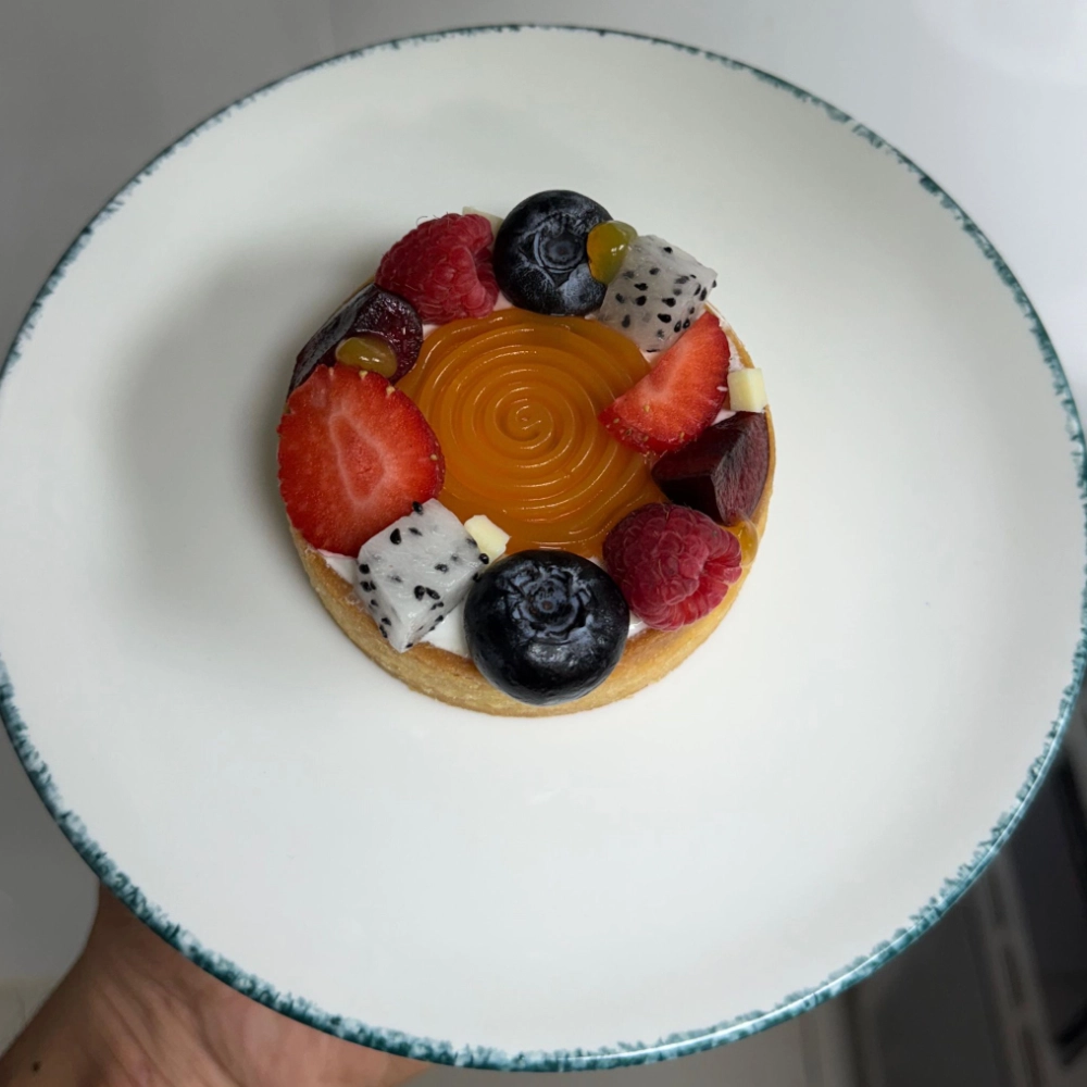 Mango, passion fruit, and pineapple compote, vanilla sable base, eggless almond cream, cream cheese Chantilly, fresh fruits and berries.