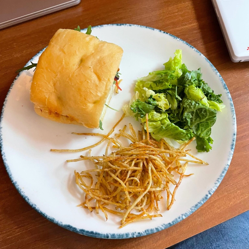 Focaccia, Grilled Chicken, Romaine, Caesar Mayo, Pickled Bhaji Mirch Green, Garlic Toum, House Salad, Potato Salli.