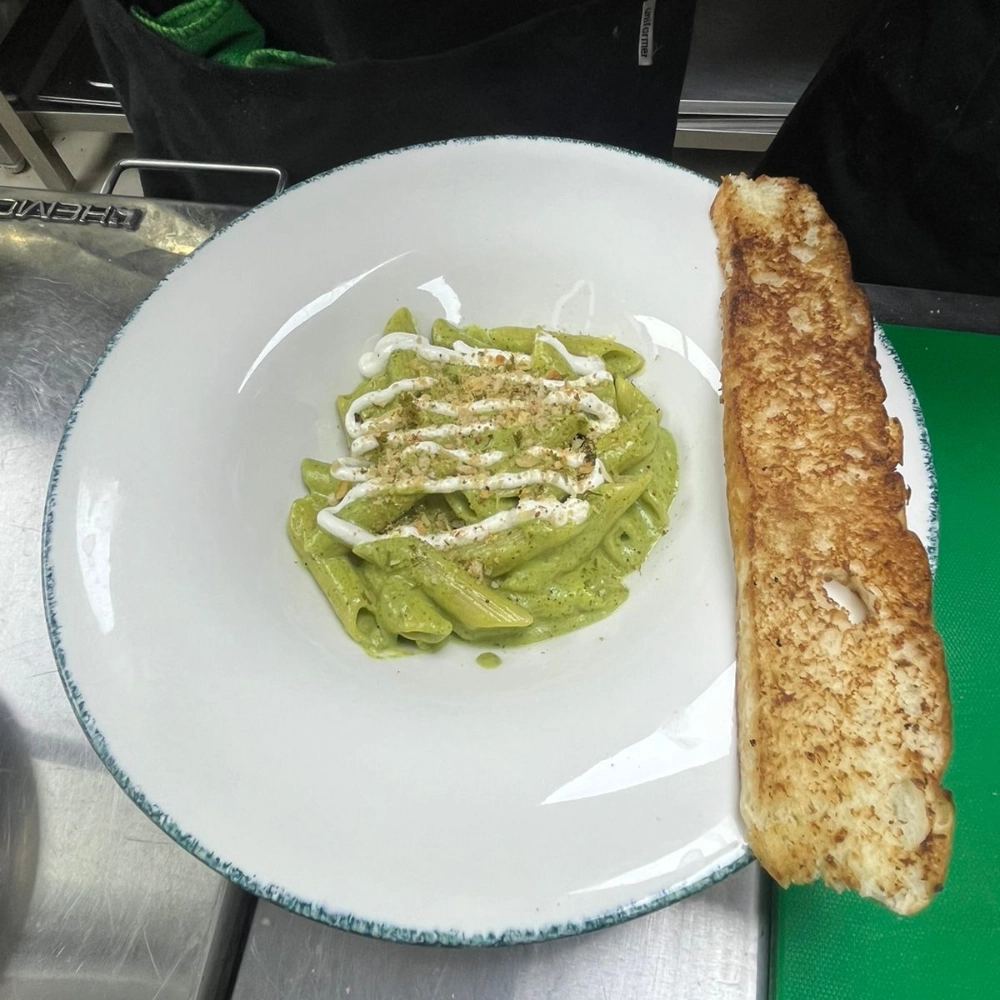 Pasta (Penne / Spaghetti), Pesto Sauce, Bechamel, Whipped Feta, Gremolata.