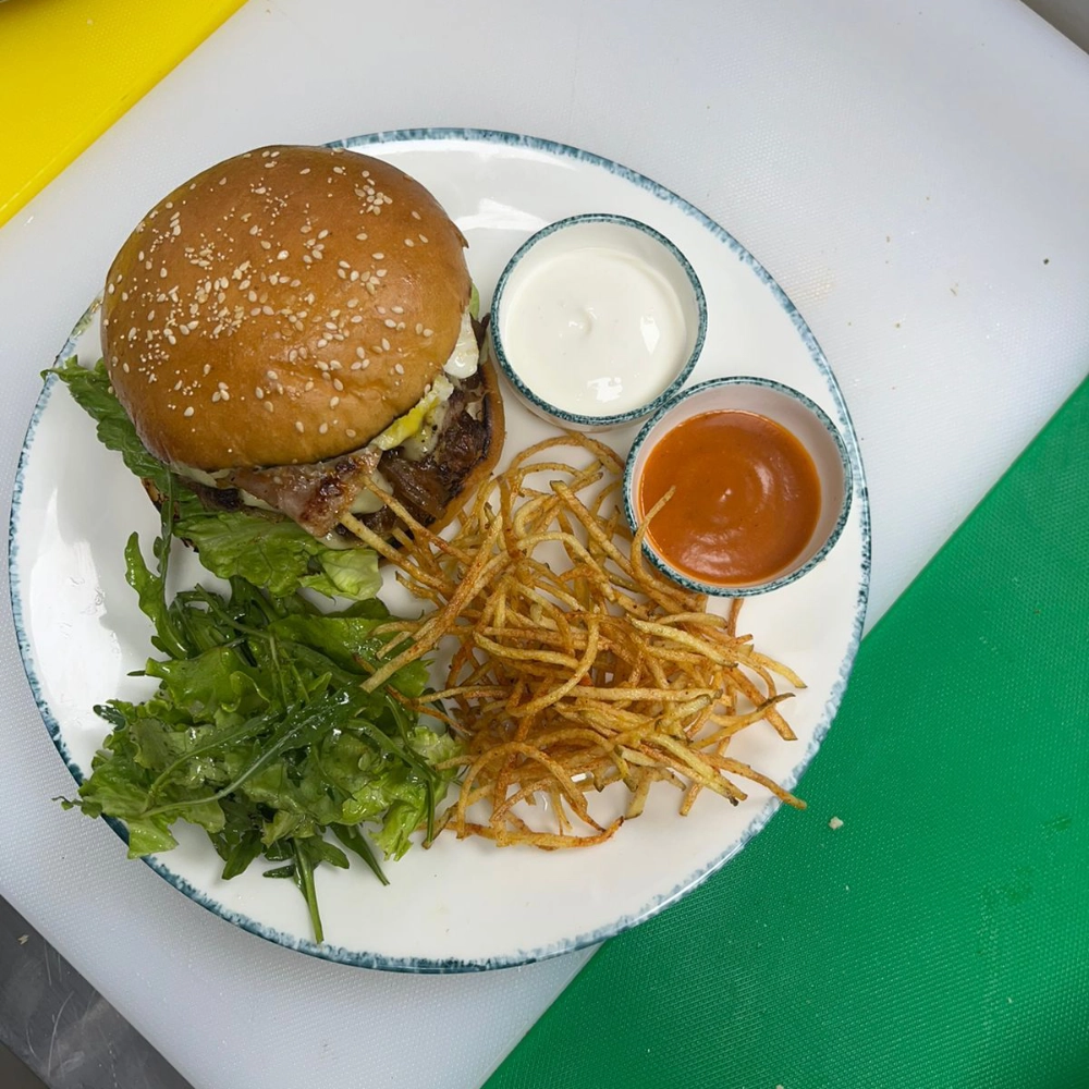 Smash 2 Lamb Patty, Cheese Slice, Caramelised Onion, Spicy Mayo, Lettuce, In-House Cucumber, House Salad & Potato Salli, Dip – Garlic Toum + Hot Sauce.