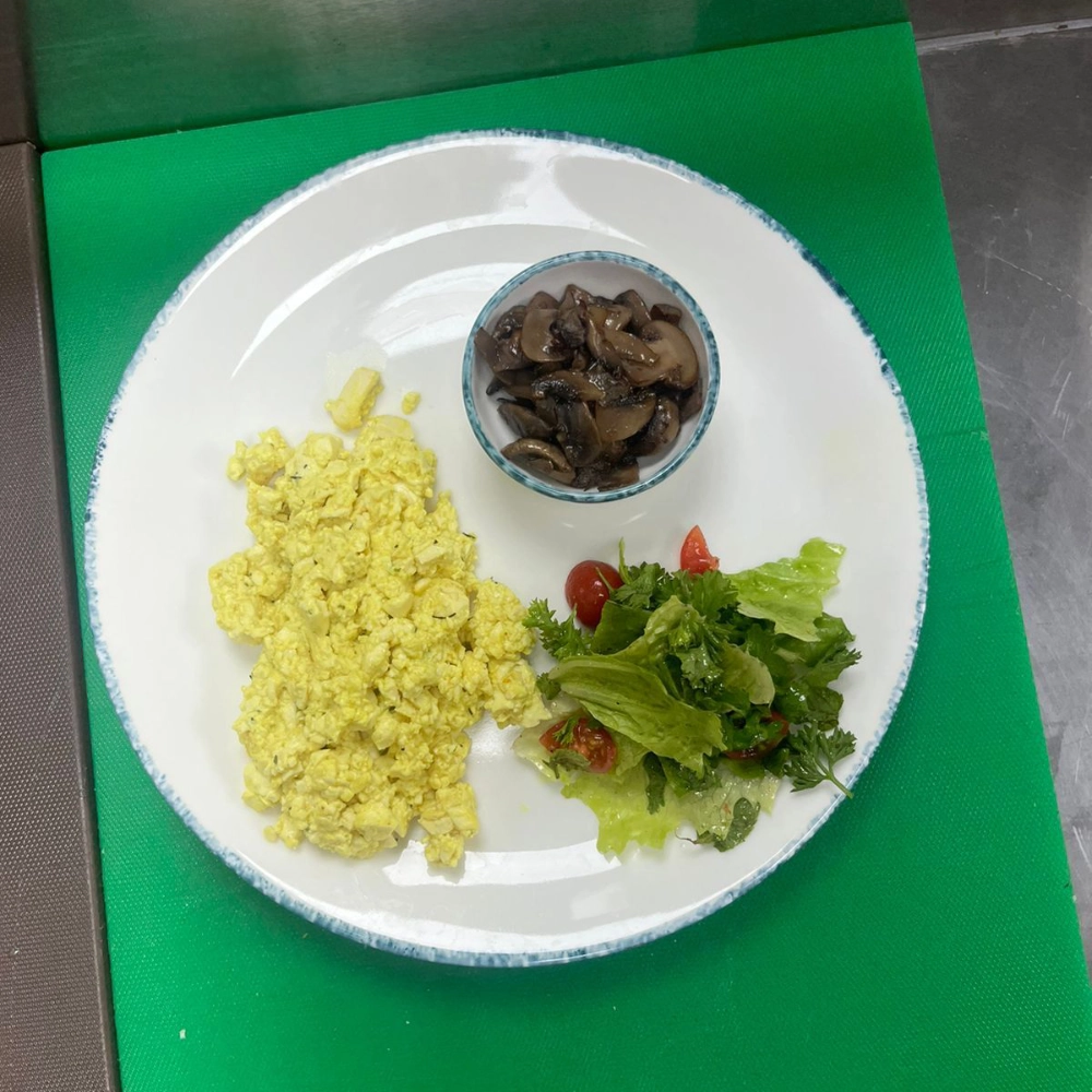 Tofu Scramble Mix, Chopped Parsley, Sautéed Mushrooms, Greens Salad, Bread Choice – Sourdough / Milk Bread.